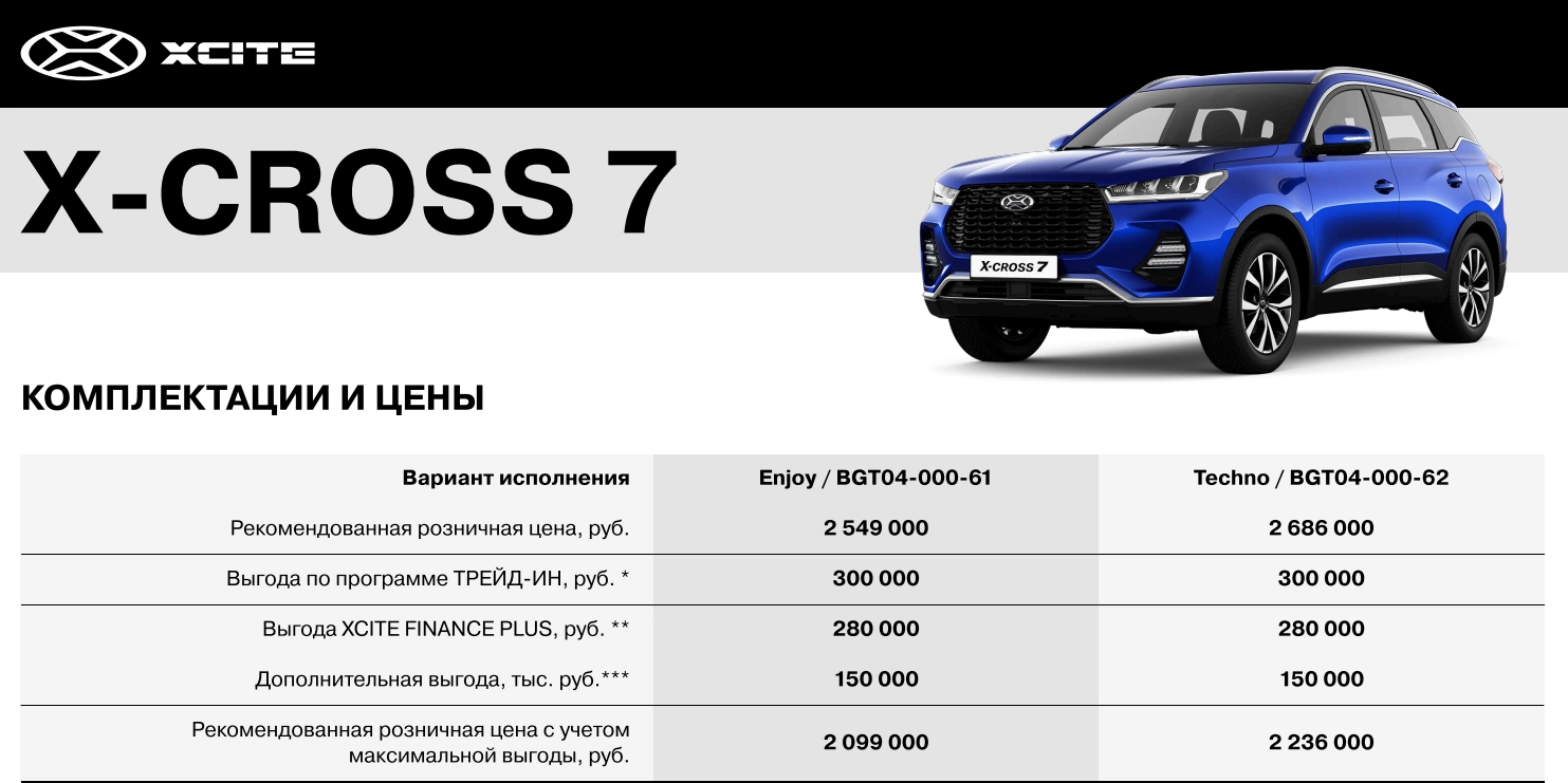 Стоит отметить, что в настоящий момент действуют специальные предложения (программа ТРЕЙД-ИН, FINANCE PLUS, и дополнительная выгода), которые позволяют получить выгоду при покупке XCITE от 730 000 до 1 030 000 рублей для X-CROSS 7 и X-CROSS 8 соответственно.