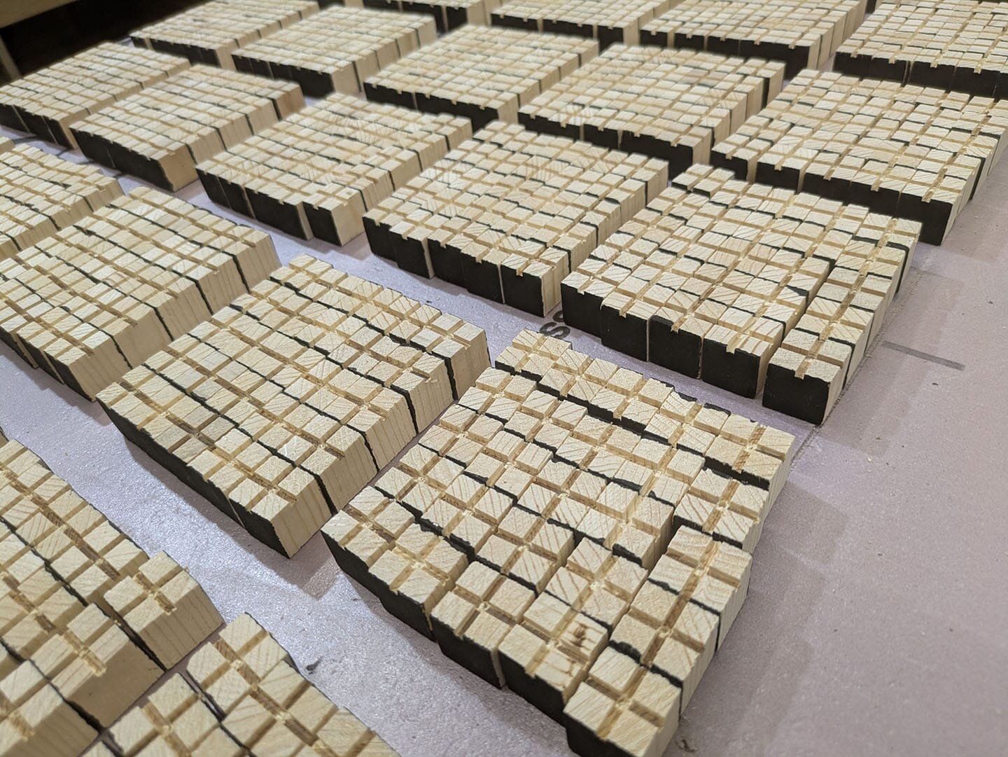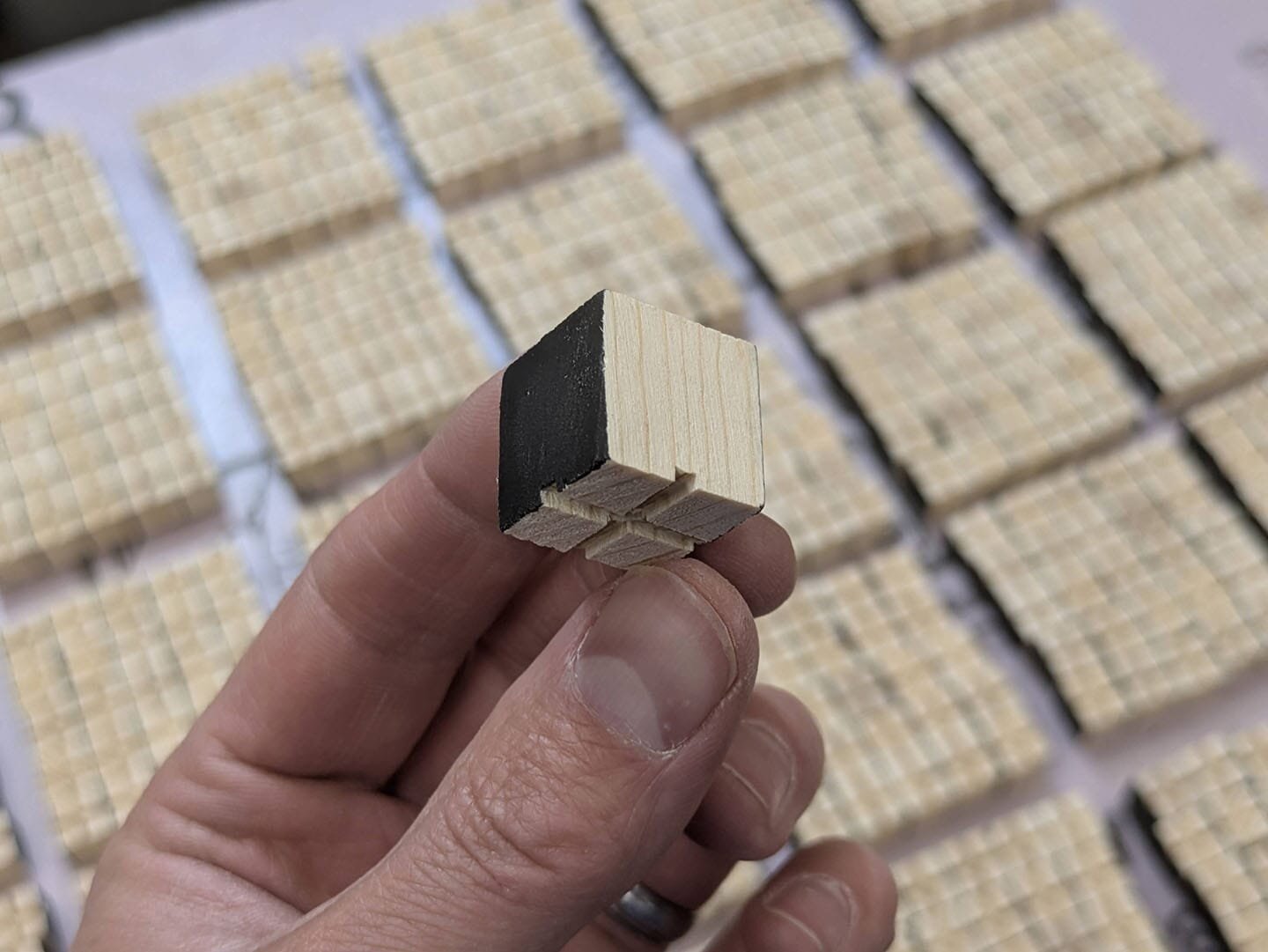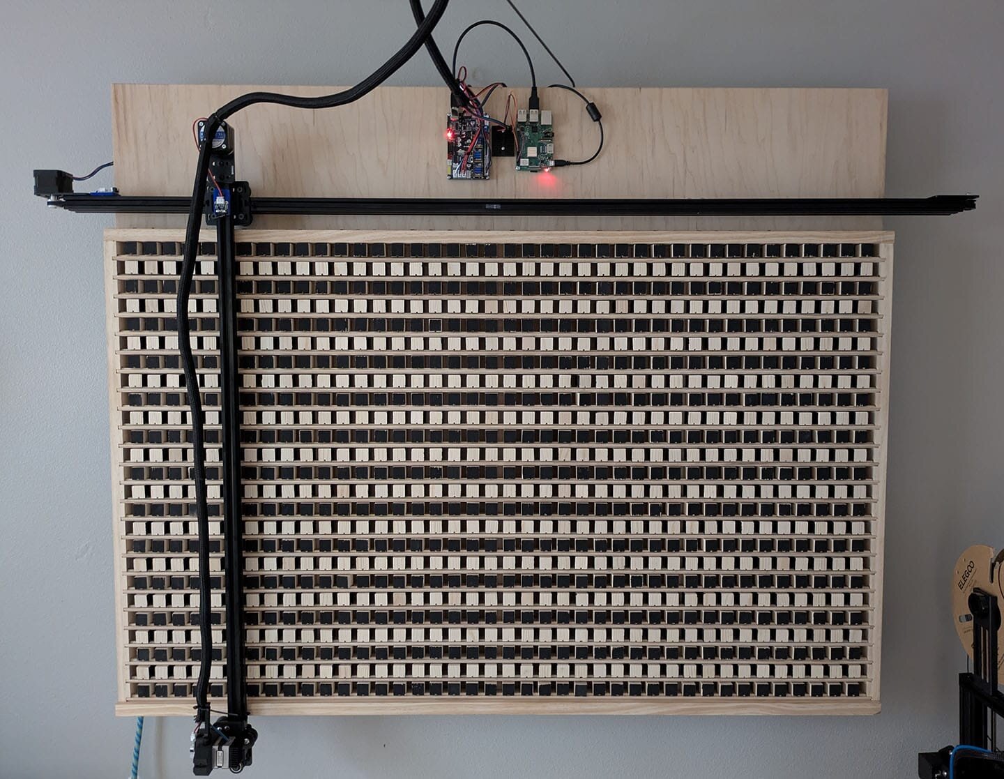 После нескольких лет экспериментов и поиска других вариантов для пикселей (например, автор пробовал шарики Nerf в том же формате, но они тоже подошли не очень хорошо), Бен Холмен пришёл к идее вместо шариков использовать кубики из дерева. Далее, он изготовит тысячу таких кубиков со специальными канавками, подготовил полочки для них и нанизал всё это на 40 тонких металлических проволок.