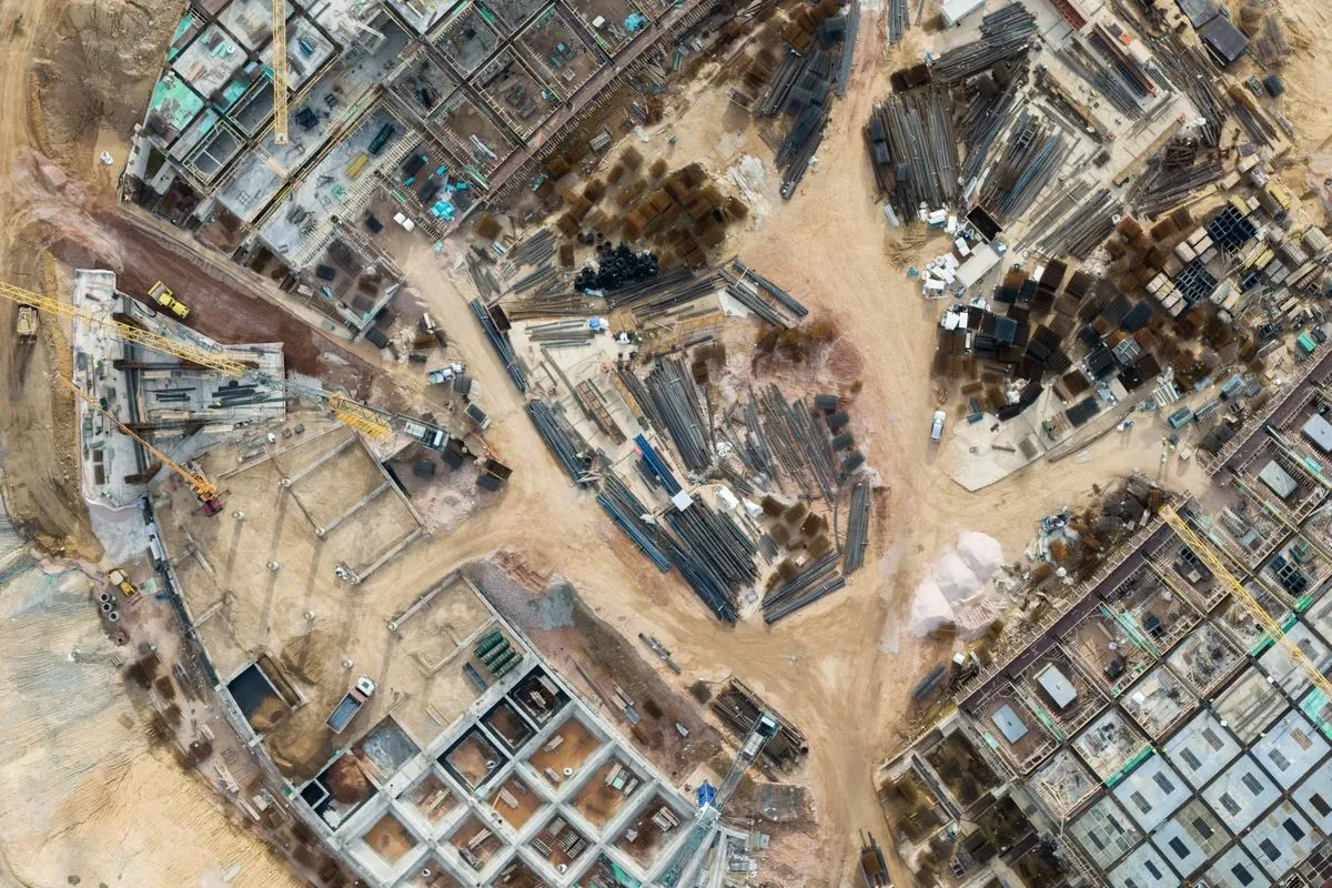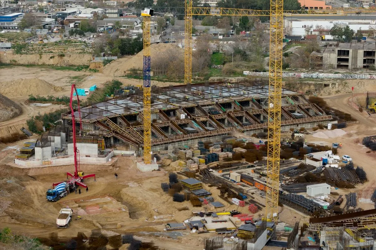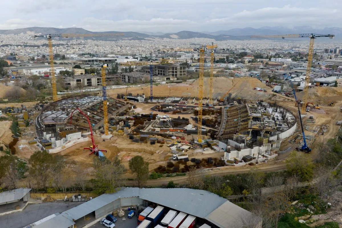 Στο εργοτάξιο λειτουργούν τουλάχιστον έξι γερανοί, επιταχύνοντας την πρόοδο του έργου.