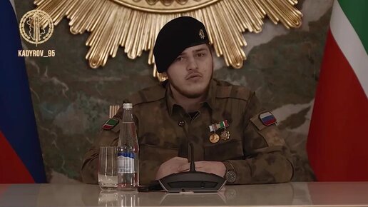Чеченский лидер прикрепил к посту видео сына, выступающего в зале перед людьми в военной форме. Ролик сопровождается музыкой, слова Адама Кадырова на записи не слышны.