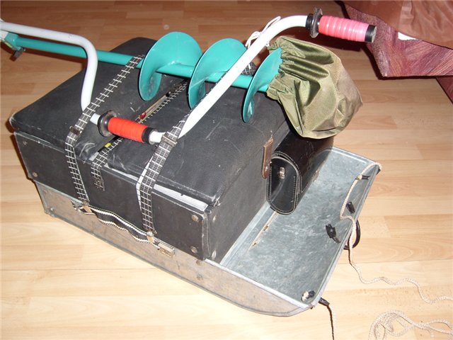 Основа - сани из оцинковки. Монтируется каркас из легкосплавных материалов, затем собираются детали конструкции: перегородки, торцевые и боковые стенки, причем они обтягиваются кожезаменителем. Две верхние створки ящика также обтягиваются кожзамом, но предварительно вставляется паролоновая прокладка, для удобства сидений. Жесткость конструкции определяется опытным путем, с целью максимально облегчить конструкцию. В передней части конструкции имеется ручка для переноса в стоячем положении, также ручки сбоков, для переноса в горизонтальном положении, боковые ручки имеют функцию крепления, для фиксирующих ледоруб ремней. В передней части имеется ранец для наживки. Основательно продумана эргономика конструкции, с целью максимально удобного сидения в процессе рыбалки. Производственные модели-либо очень высокие и приходится нагибаться, либо очень низкие, что также вызывает напряжение позвоночника. Эту модель я делал под себя — очень удобно. Ящики открываются под углом в 60гр., что позволяет размещать любые вещи.