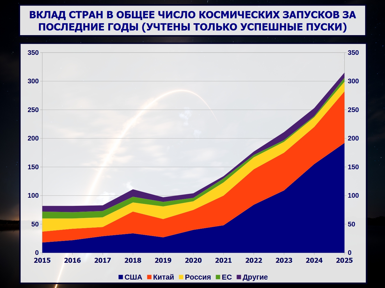 Всего в 2025 году было совершено 325 космических запусков, из них 315 были полностью успешными. В 2024 году был совершён 261 космический запуск, из которых 253 были полностью успешными, в 2023 — 211 из 222, в 2022 — 178 из 186, в 2021 — 115 из 134 в 2020 — 104 из 114, в 2019 — 96 из 102, в 2018 — 111 из 114, в 2017 — 83 из 90, в 2016 — 82 из 85, в 2015 — 82 из 87.