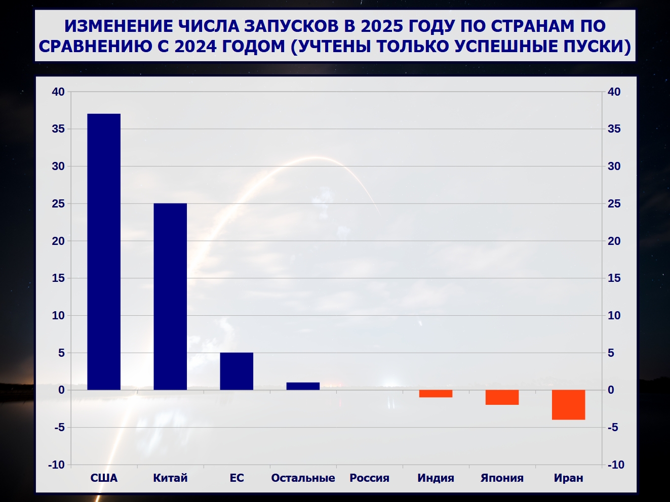 Наша страна вновь занимает третье место с 17 успешными запусками, аварий не было. В 2024 году также было 17 успешных пусков, в 2023 — 19, в 2022 — 22, в 2021 — 24, в 2020 — 17, в 2019 — 25, в 2018 — 19, в 2017 — 19, в 2016 — 20, в 2015 — 27.