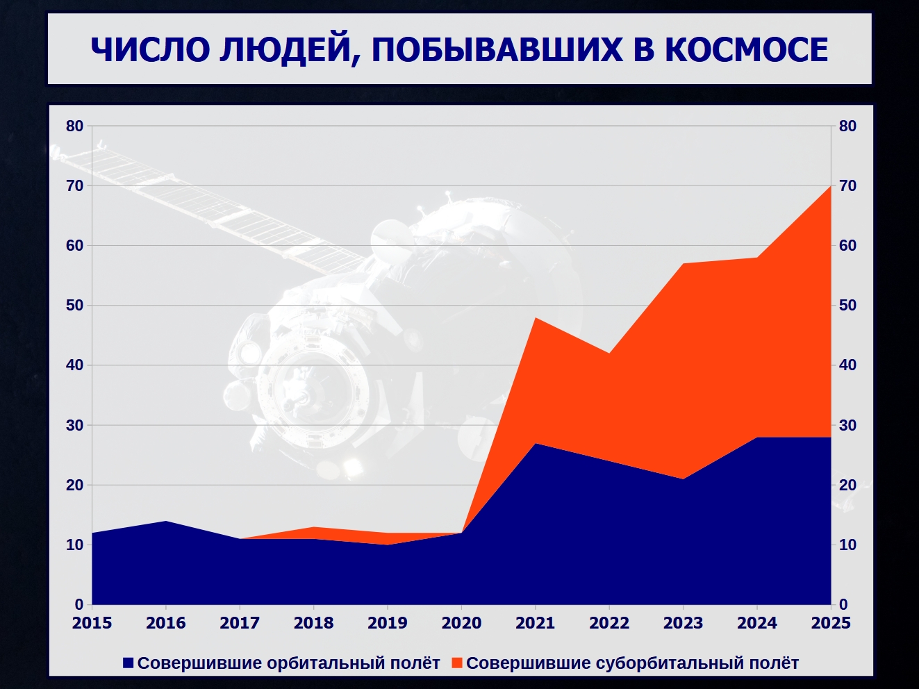 В 2025 году в космосе побывало 70 человек, из которых 28 совершили полноценный орбитальный полёт, а 42 — суборбитальный. Профессиональных космонавтов было 24 человека, остальные были космическими туристами. Из них 4 совершили полноценный орбитальный полёт, а 42 — суборбитальный.