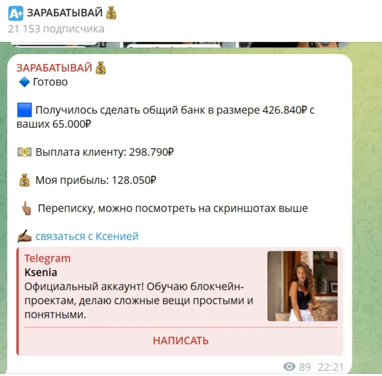 Корреспондента УрБК включили в телеграм-канал, автор которого по имени Ксения сходу предлагала подписчикам огромный доход с вложений в криптовалюту. В переписке с корреспондентом УрБК автор канала обещала следующее: «+500-800% к депозиту за 24 часа!», «Ваш капитал застрахован нашим резервным фондом!», «Минимальный вход — от 50 тыс. ₽». При этом у канала в закрепленном сообщении была пометка о регистрации на Госуслугах и пометка «А+».