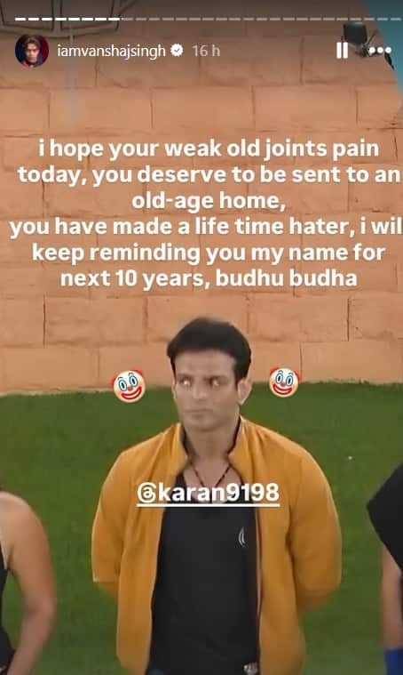 Soon after the eviction, Vanshaj moved to Instagram to post a meme calling Karan a "Mandbudhhi." In another slide, he referred to the television star and said, "I hope your weak old joints pain today, you deserve to be sent to an old-age home, you have made a lifetime hater, I will keep reminding you my name for the next 10 years, budhu budha (sic)."