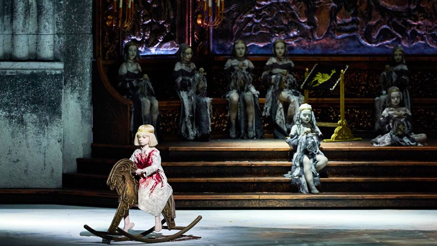 Но вернемся к детям. В сопровождении к спектаклю утверждается, что их на сцене — сереньких, колченогих, зомбеобразных — аж пять десятков. Я насчитал чуть больше тридцати, но все равно это очень много. Получился настоящий альбом, заключивший целое поколение — утраченное, погубленное уж не столь важно, как именно: голодом, смутой или ударом ножа. Населенность постановки поражает в принципе. Пятьдесят детей, полсотни актеров миманса, камерный хор, большой хор — все это вдобавок к основным и второстепенным персонажам. Как они умудрились, не столкнувшись, разойтись на поклонах под овацию — еще один удивительный момент спектакля.