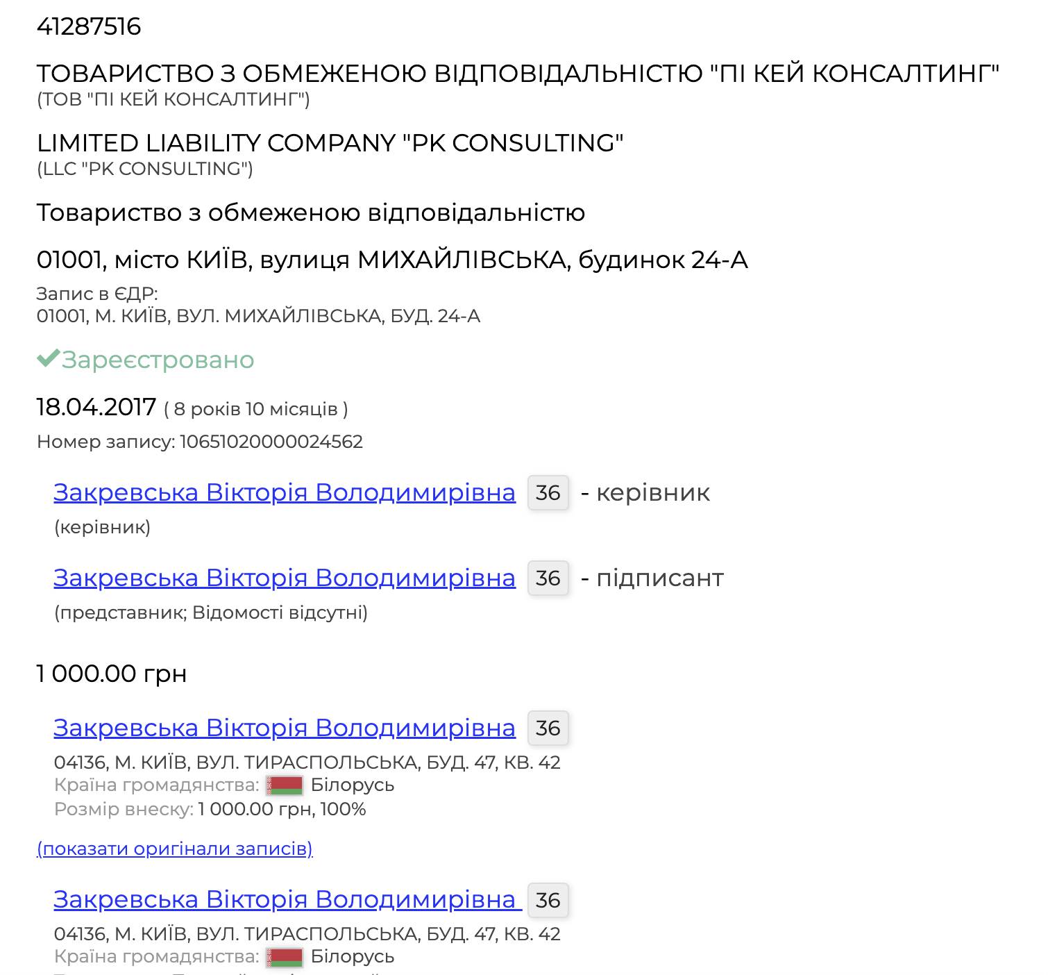 Що це таке Boldozer Consulting? Це торгівельна марка, яка зареєстрована на ТОВ “Пі Кей Консалтинг”, де власником є громадянка РБ Закревська. Фірма заснована в 2017 році з капіталом в 1 тис. гривень. Саме ця фірма також є співзасновником організації UGC. Тобто через громадську організацію відпрацьовуються цілком комерційні замовлення. Але “Пі Кей Консалтинг” взагалі не декларує видатків та придбутків вже декілька років. На сайті вказані “спеціалісти” серед яких також є Кучухідзе.