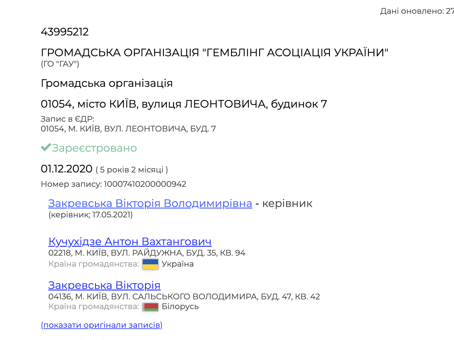 Але більш цікава тут інша співзасновниця проєкту, яка також очолює ГО «Гемблінг Асоціація України» (UGC) – Вікторія Закревська. Ця структура з’явилася наприкінці 2020-го року. Вона займається діяльністю в інтересах гемблінг-сегменту та його іміджу. Тут теж присутній Кучухідзе.