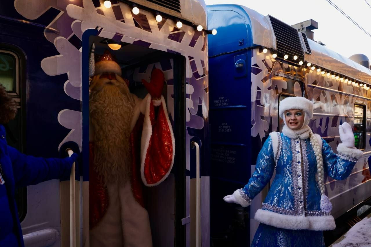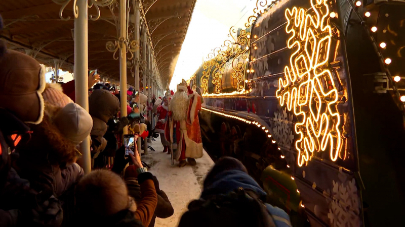 Новогодний поезд Деда Мороза прибыл в Северную столицу накануне Рождества. Специальный состав пробудет на станции Новый Петергоф в течение двух дней, после чего поедет дальше по России.