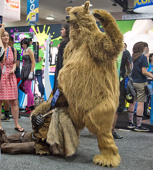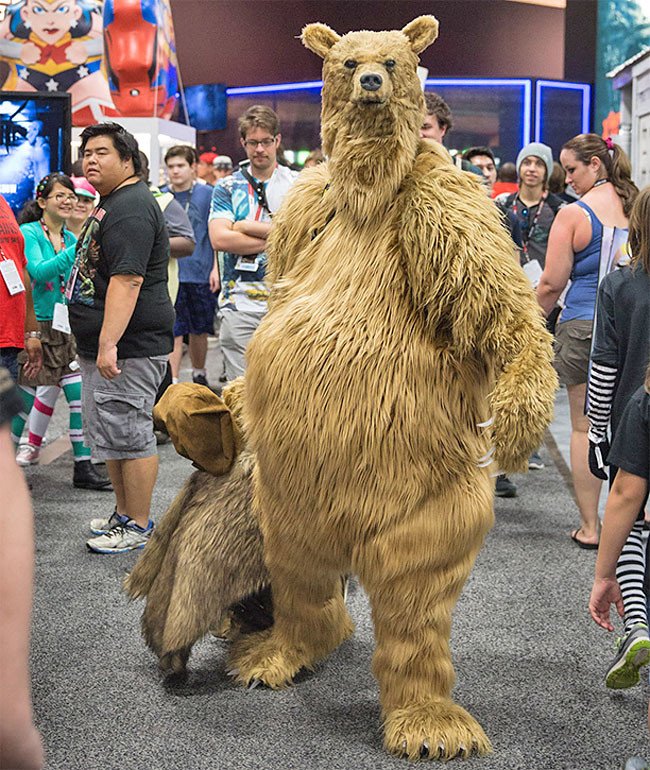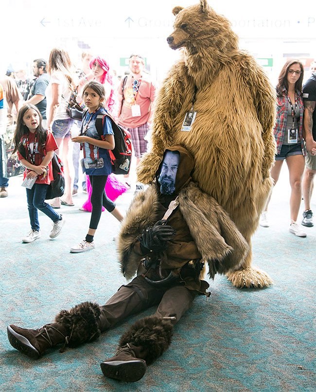 На прошедшей недавно в Сан-Диего ежегодной конвенции Comic-Con 2016 было немало оригинальных косплейщиков, но всех их заткнул за пояс Адам Сэвидж, пришедший в костюме медведя из фильма "Вышивший".