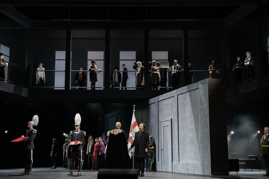 С учётом этих объективных реалий спектакль Василия Бархатова выглядит честной и профессиональной попыткой реанимации заведомо проблемного материала. Режиссёр аккуратно работает с политическим сюжетом, не впадая в прямолинейные актуализации, и выстраивает сценическое действие вокруг идеи власти как компромисса между личной катастрофой и общественным успехом. Венецианская республика здесь читается как прообраз современной демократии с её зависимостью от лайков-одобрений и безответственных активистов-крикунов, а Симон Бокканегра — как фигура бывшего маргинала, вынесенного на вершину властной пирамиды в качестве якоря-стабилизатора для решения непримиримых межклановых конфликтов.