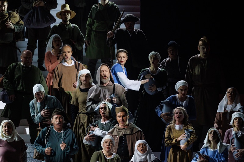 Исторически сложилось, что вокальный дуализм партии Иоанны узаконен в правах, и с равной степенью соответствия вокальным задачам ее могут исполнять как драматические меццо-сопрано, так и драматические сопрано. Театр обратился к версии для меццо-сопрано, но если Екатерина Лукаш – природное меццо-сопрано с рельефно выраженной тембральной и драматической фактурой, то Лариса Андреева, исполнившая главную партию во втором составе и позиционирующая себя как меццо-сопрано, – на самом деле латентное сопрано. На этой сцене она исполнила широкий спектр партий меццо-сопрано, но каждый раз, слушая певицу, возникало ощущение того, что это амплуа ей недвусмысленно чуждо. Именно так это ожидаемо случилось во второй премьерный день.