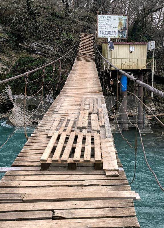 Как рассказали «Базе» местные жители, после новогодних каникул маршрут до школы № 66 сократили. Дети теперь должны добираться до автобусной остановки на территории форелевого хозяйства и только оттуда ехать на уроки. А путь пролегает по аварийному подвесному мосту, под которым протекает бурная горная река Мзымта.
